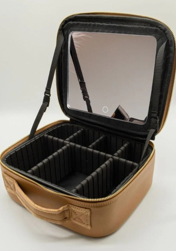 These leather travel cases are perfect to take with you anywhere. Featuring a rechargeable led light up mirror with 3 brightness and warmth settings. Straps to hold the bag open while using the mirror, and adjustable interior compartments lined with foam to keep your things safe.