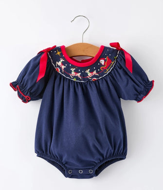 Christmas Holiday Celebration Baby Girls Romper: Navy with Santa Sleigh