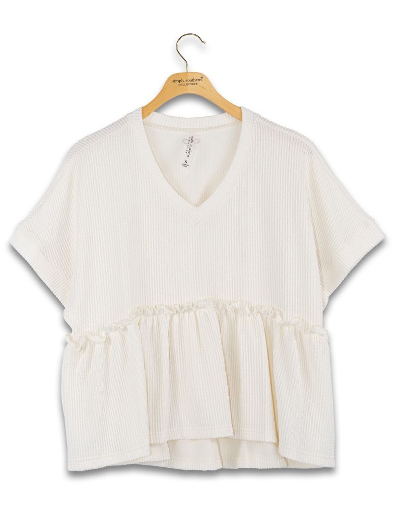 The Corded Ruffle Top features a high low waistline with gathered fabric, V-neckline, cuffed short sleeves, and regular fit body. Made of 20% rayon, 75% polyester, and 5% spandex.