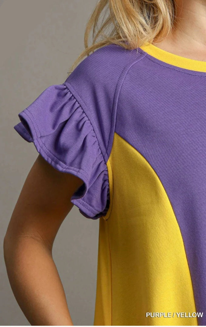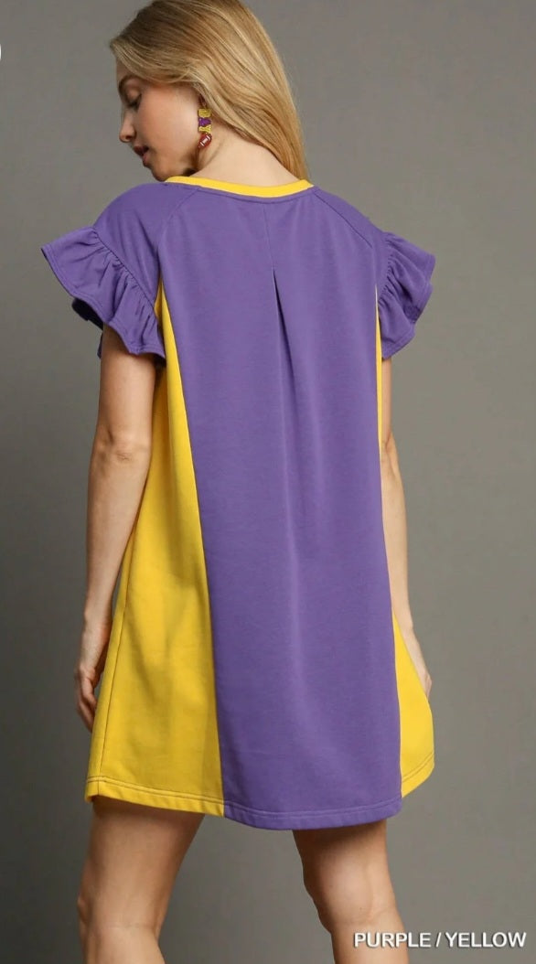Turn heads this game day in our gorgeous purple and yellow dress - the perfect blend of team spirit and feminine charm! Designed with playful ruffle sleeves, a flattering relaxed fit and soft, breathable fabric. This dress keeps you confident for game celebrations, team spirit events, tailgates or stadium stands!