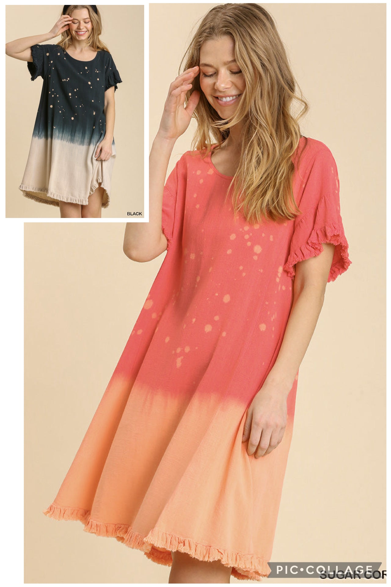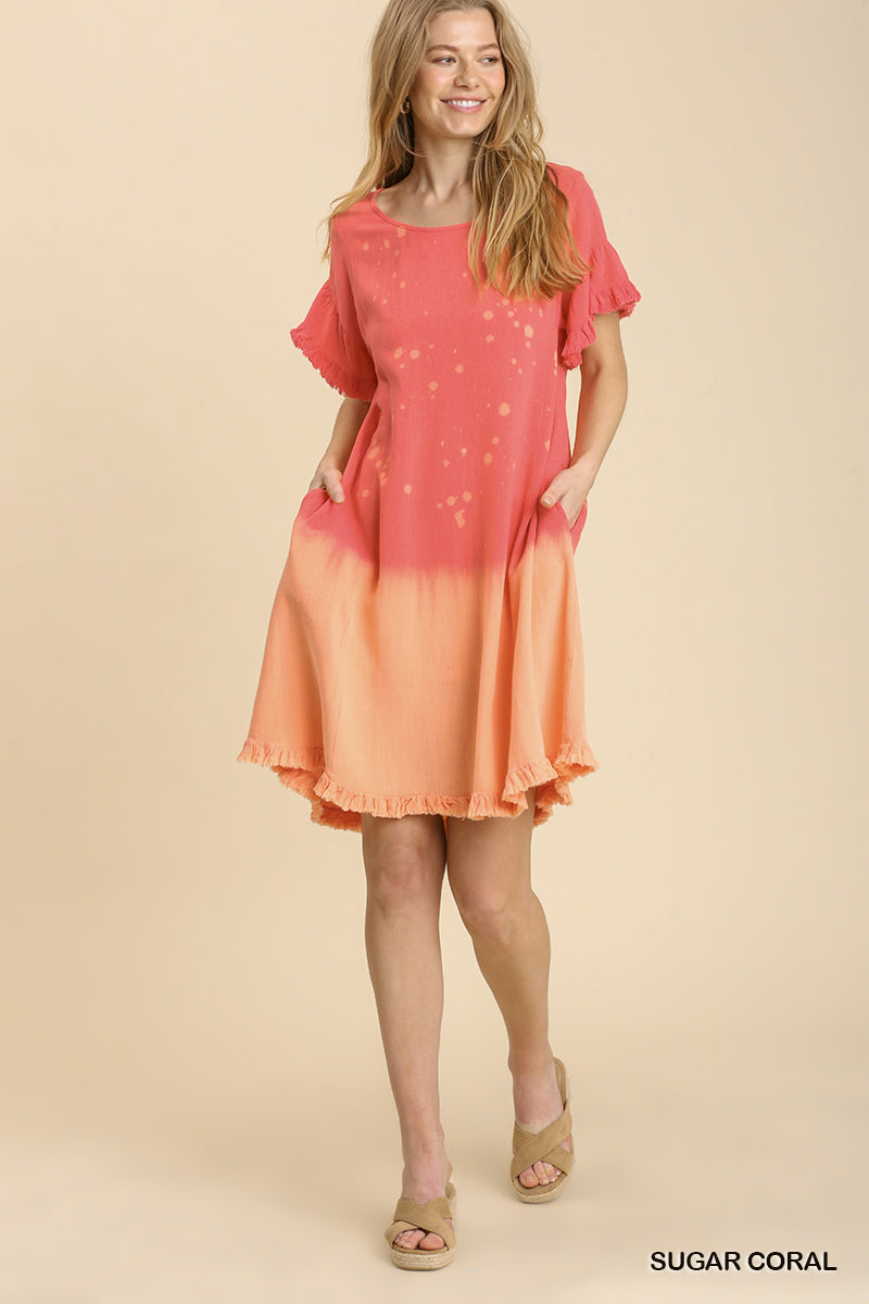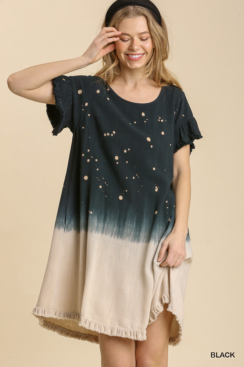 Linen Blend Bleach Dip Dye Short Ruffle Sleeve Round Neck Dress with Ruffle Hem