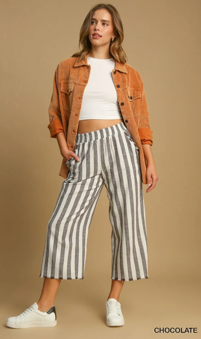 Umgee Linen Striped Waistband Pants - Chocolate