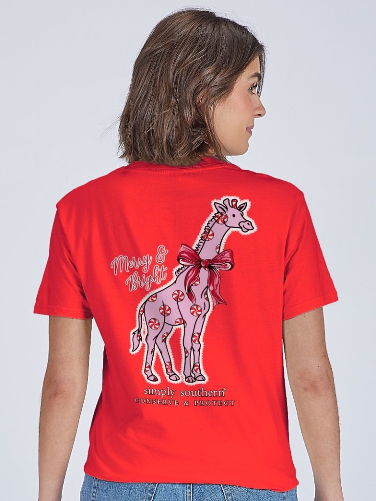 Red short sleeve shirt with the phrase 'Merry and Bright' and the silhouette of a giraffe filled with a peppermint candy pattern. Simply Southern logo below and on left chest. 100% cotton. Unisex sizing. Giraffe tracker.