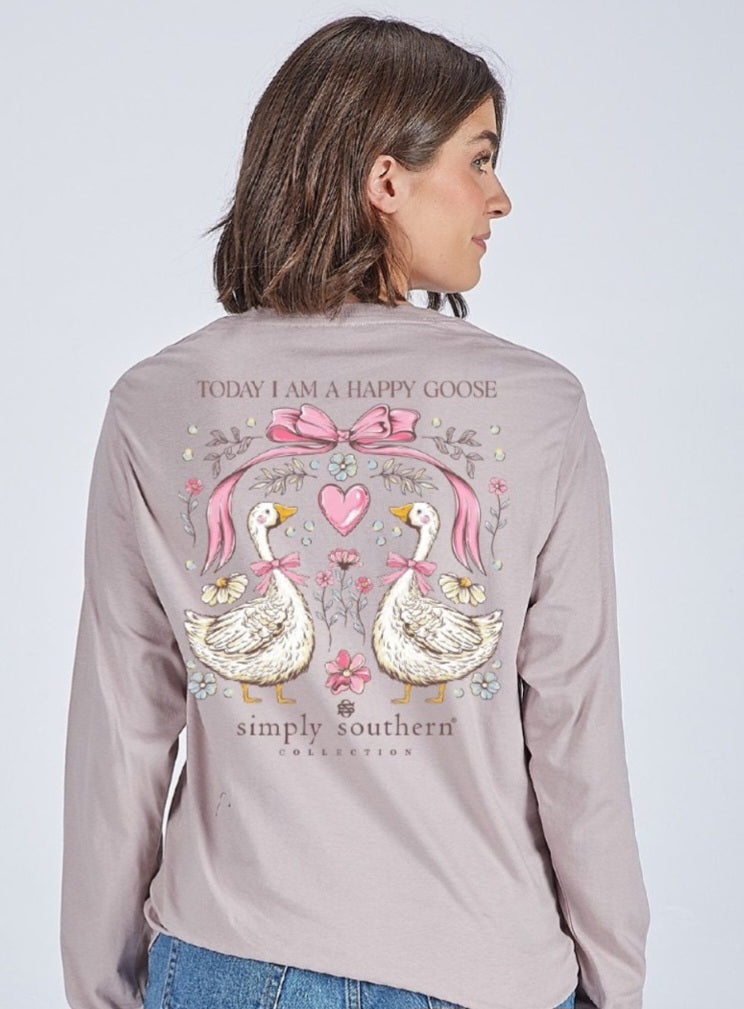 Driftwood grey long sleeve shirt with the phrase 'Today I am a happy goose' and a pair of geese under a pink ribbon surrounded by flowers. Simply Southern logo below. Similar design on left chest. 100% cotton. Unisex sizing.