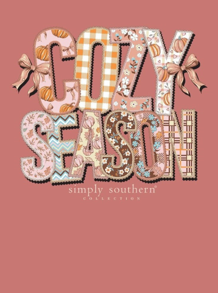 Maple short sleeve shirt with the phrase 'Cozy Season', each letter being filled with an autumn themed pattern. Simply Southern logo below and on left chest. 100% cotton. Unisex sizing.