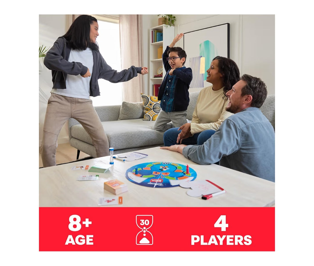 Disney Edition: Experience the magic in this kids vs. parents, Disney-themed game of fun drawing & active challenges. Teams go head-to-head, using their Disney knowledge to get the right answer