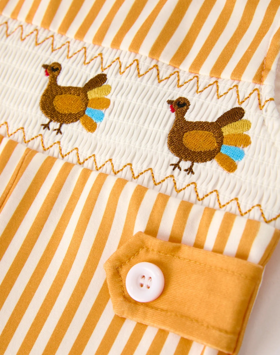 Celebrate the season in style with this charming Fall Thanksgiving Chicken Smock Romper for boys. Featuring playful embroidered details and vibrant orange stripes, it combines festive flair with comfortable wear. Perfect for family gatherings or holiday photos, this romper ensures your little one looks adorable while staying cozy throughout the festivities.