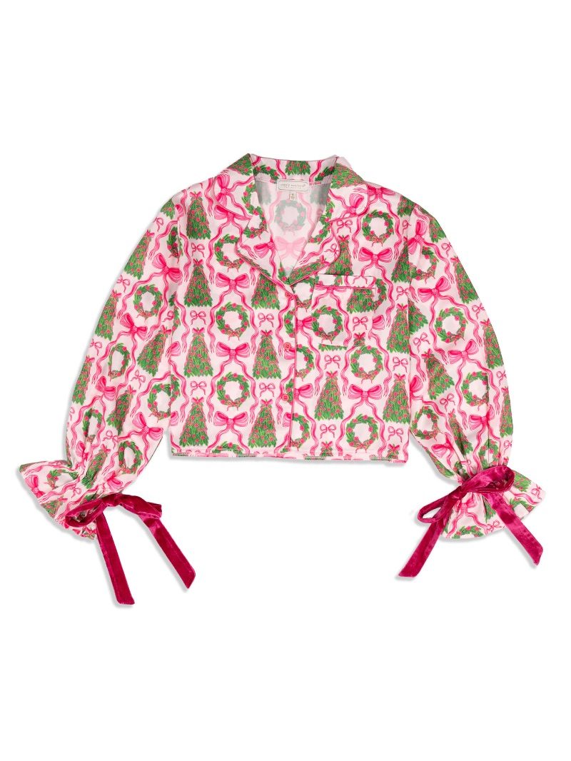 Cozy up in these Bow Pajamas featuring complementary bows on cuffs, long sleeve button up shirt with pocket and wide leg pajama pant. Made of 100% polyester.