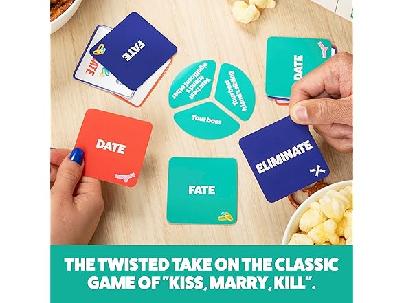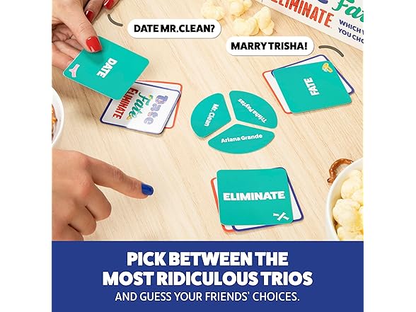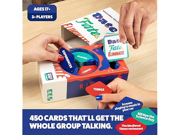 Date. Fate. Eliminate. In this twist on the classic game of "kiss marry kill", you and your friends will choose favorites across absurd categories: Experiences, People, and Things. Trust us, ranking "your ex", "porta potties", and "the feeling of the DVD logo hitting the corner of the screen" is harder than it sounds. Win points when you correctly guess your friends' picks! This card game is brought to you by Relatable, the makers of tons of epic card games for friend groups, including What Do You Meme?